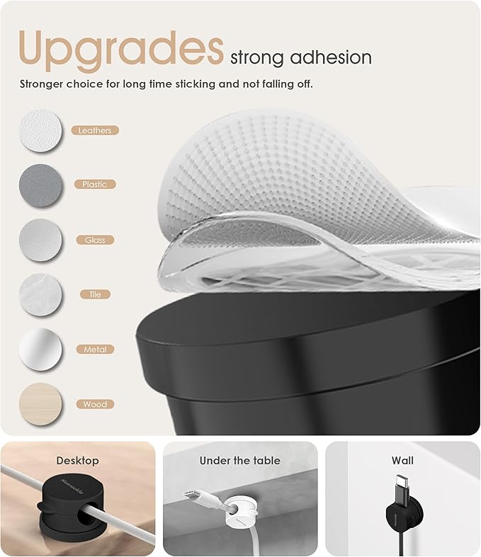 - 【No-Residue Acrylic Adhesive】Using upgraded acrylic adhesive, it is stronger and will not leave any residue when peeled off. Simply stick the cable organizer to any smooth, dry surface such as a wooden table, glass or tile, etc. the transparent adhesive pads won't damage your table, nightstand or walls. [Warm Tips: Please clean the desired surface without dust before sticking, and keep pressing for 30 seconds to enhance the adhesion of the sticky pad. Highly recommend waiting for 1 hours for better use]