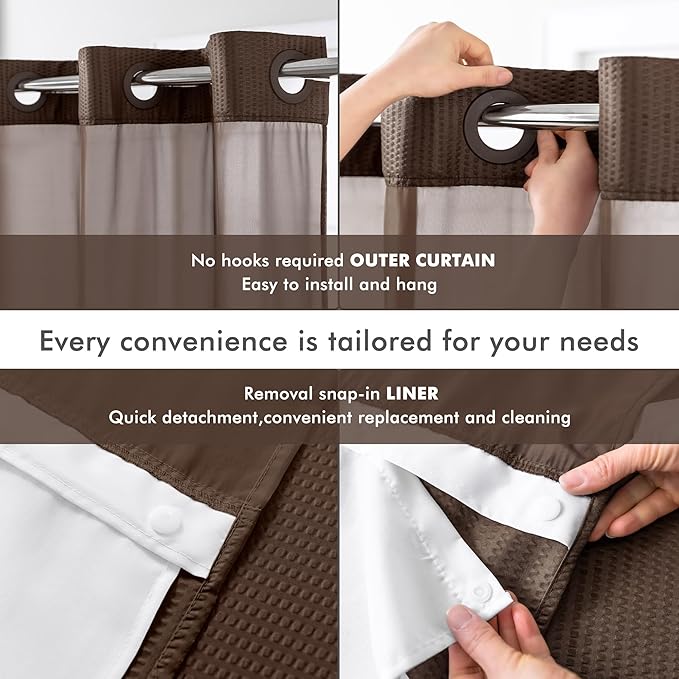 Mrs Awesome No Hook Shower Curtain with Snap-in Liner, Embossed Waffle Design Fabric Shower Curtain for Bathroom, Soft & Lightweight, 71x74, Chocolate