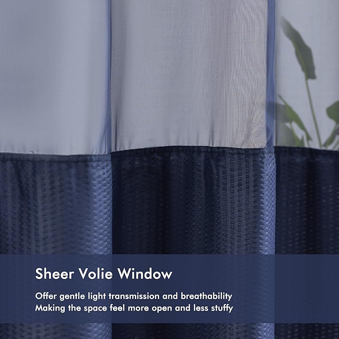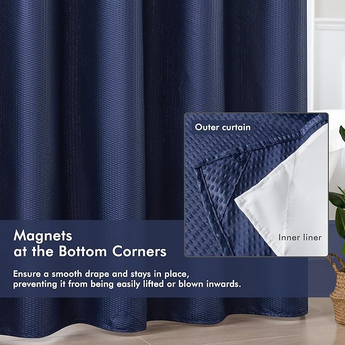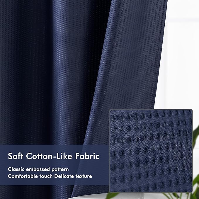 Mrs Awesome No Hook Shower Curtain with Snap-in Liner, Embossed Waffle Design Fabric Shower Curtain for Bathroom, Soft & Lightweight, 71x74, Navy Blue