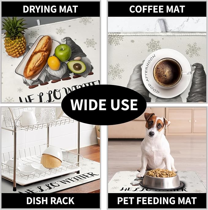 - Easy Storage & Care: Machine washable or hand washable. Machine wash with cold water in gentle cycle. Do not bleach, tumble dry low. The winter Dish Drying Mat for Kitchen Counter is designed to be durable and long-lasting. Includes a sewn in hang tab to hang up mat to dry fast