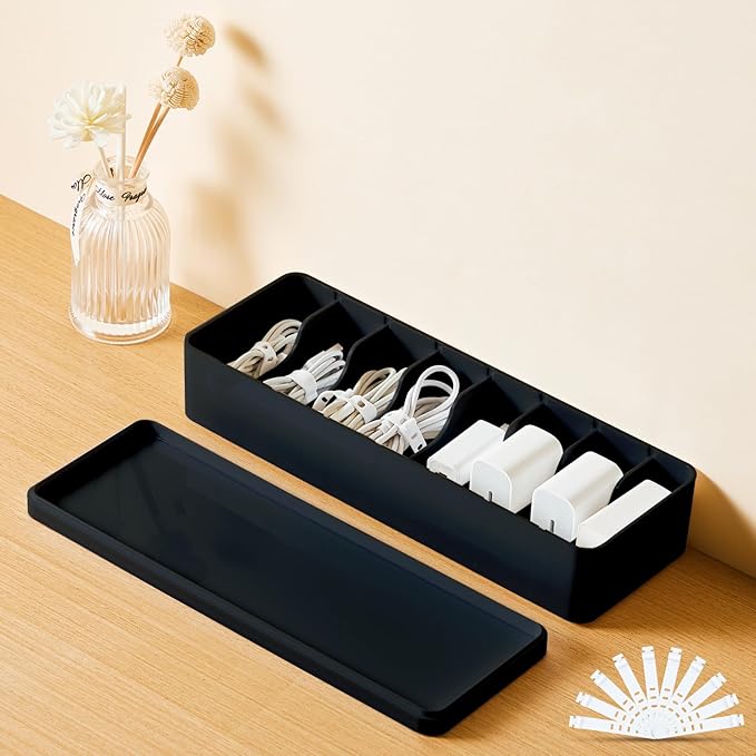 Tatuo 1 Pcs Cable Organizer Box with Wire Ties, Plastic Cord Storage Box with Lid, Electronics Organizer for Home Office Desk Organizers and Accessories (10.79'' X 3.78'' X 1.97'',Black)