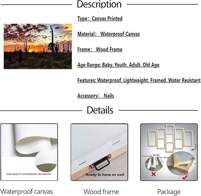 - Cactus wall art size: 18''H x 24''W, cactus landscape picture canvas prints will easy ready to hang.