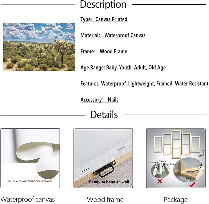 - Cactus wall art size: 12''H x 16''W, cactus landscape picture canvas prints will easy ready to hang.