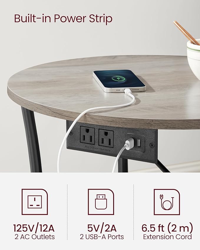 VASAGLE Side Table, 2-Tier Round End Table with Power Outlets, Nightstand with Steel Frame for Small Spaces, Living Room, Bedroom, Heather Greige and Ink Black ULET077L01