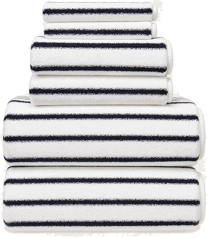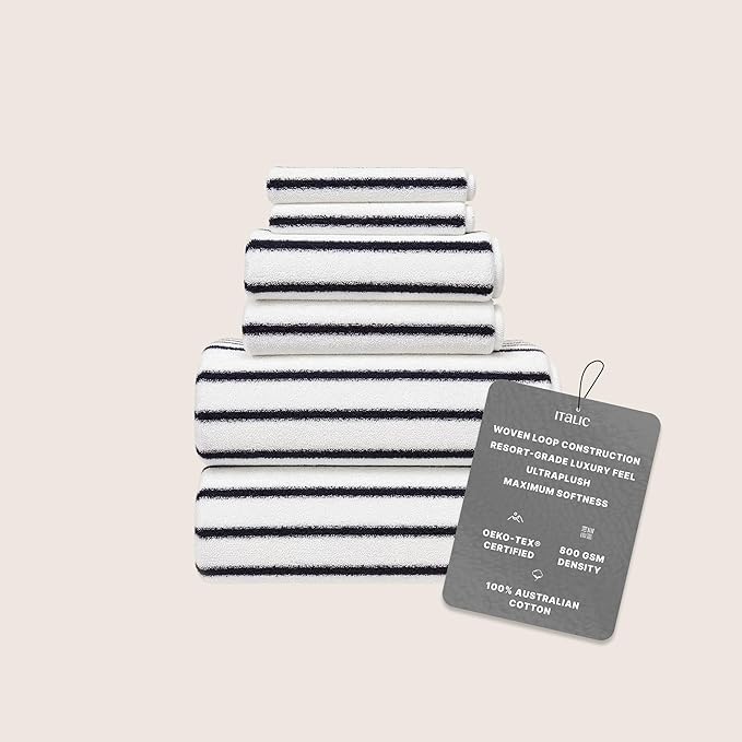 Italic Ultraplush 100% Australian Cotton Standard 6-Piece Set, 2 Bath, 2 Hand, 2 Washcloths, 800GSM Highly Absorbent & Quick-Dry, Resort Grade, Striped (White & Blue)
