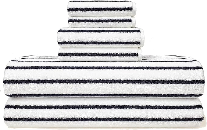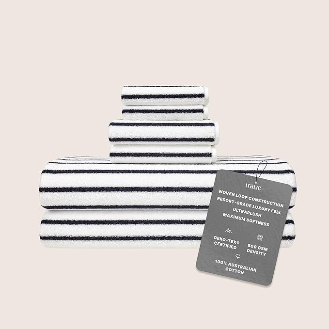 Italic Ultraplush Luxe 6 Piece Towel Set – 2 Bath Sheets, 2 Hand Towels, 2 Washcloths – 800GSM Highly Absorbent & Quick Dry, Resort Grade 100% Australian Cotton Towels, Striped (White & Blue)
