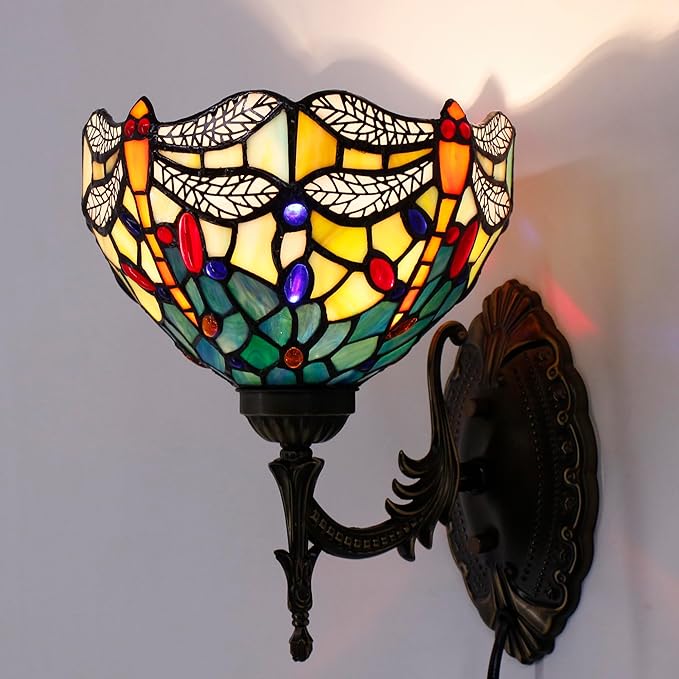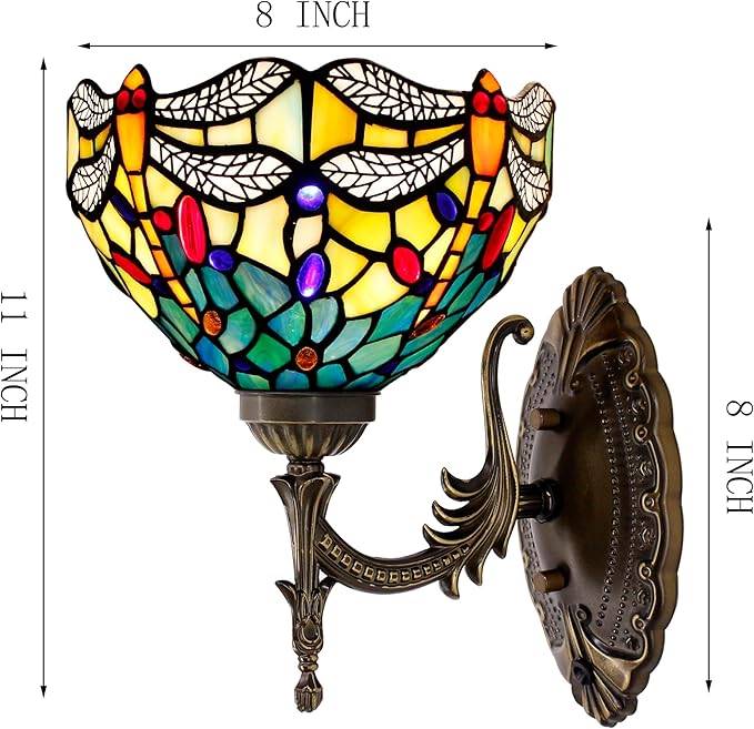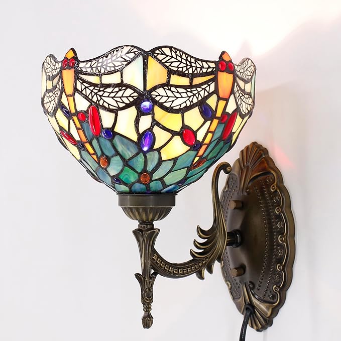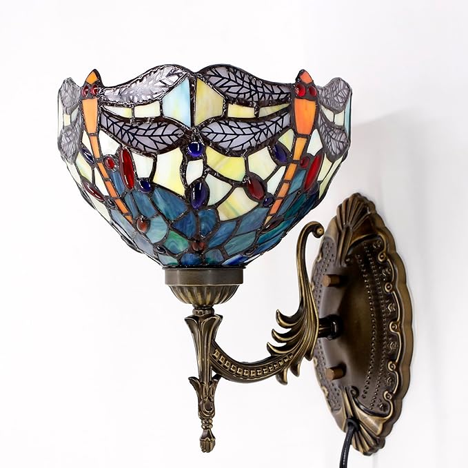 Tiffany Wall Sconce Lamp Blue Stained Glass Flower Style 8X10.5X11 Inch Plug in Wall Bedside Light for Hallway Bedroom (Blue Yellow Dragonfly Style)