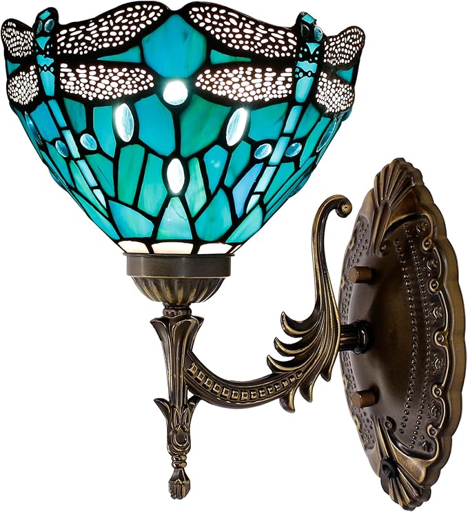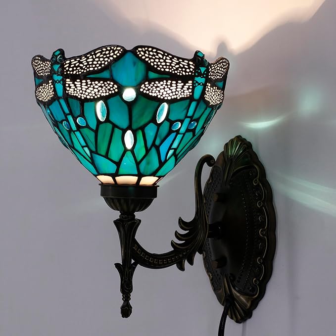 Tiffany Wall Sconce Lamp Blue Stained Glass Flower Style 8X10.5X11 Inch Plug in Wall Bedside Light for Hallway Bedroom (Green Blue Dragonfly Style)