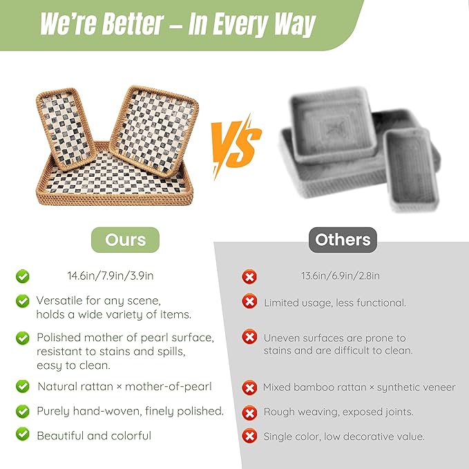 - Handcrafted artisan design with a natural rattan border: Each Decorative Rattan Tray features intricate mother of pearl inlay, blending elegant craftsmanship with boho home decor for any space.