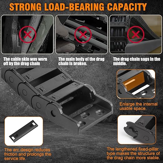 - The Drag Chain consists of many small sections. It can be easily opened with a flat-head screwdriver and combined freely.Made of PA66 nylon, it's characterized by its aesthetic appearance, high gloss, odorlessness, as well as high tensile strength, impact resistance, and excellent wear and corrosion resistance.