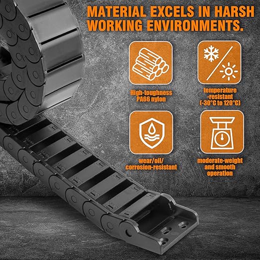 - The Drag Chain consists of many small sections. It can be easily opened with a flat-head screwdriver and combined freely.Made of PA66 nylon, it's characterized by its aesthetic appearance, high gloss, odorlessness, as well as high tensile strength, impact resistance, and excellent wear and corrosion resistance.
