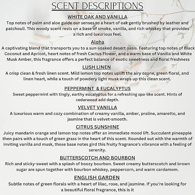 - MANY SCENTS TO CHOOSE FROM: Scent Descriptions In Photos - White Oak & Vanilla, Peppermint Eucalyptus, Lavender, Aloha, Apple Maple Bourbon, English Garden, Fraser Fir, Citrus Sunshine, Sugared Cranberry, Butterscotch & Bourbon, Velvet Vanilla, Lush Linen, Pumpkin Spice Buttercream, Snickerdoodle, Autumn Glow