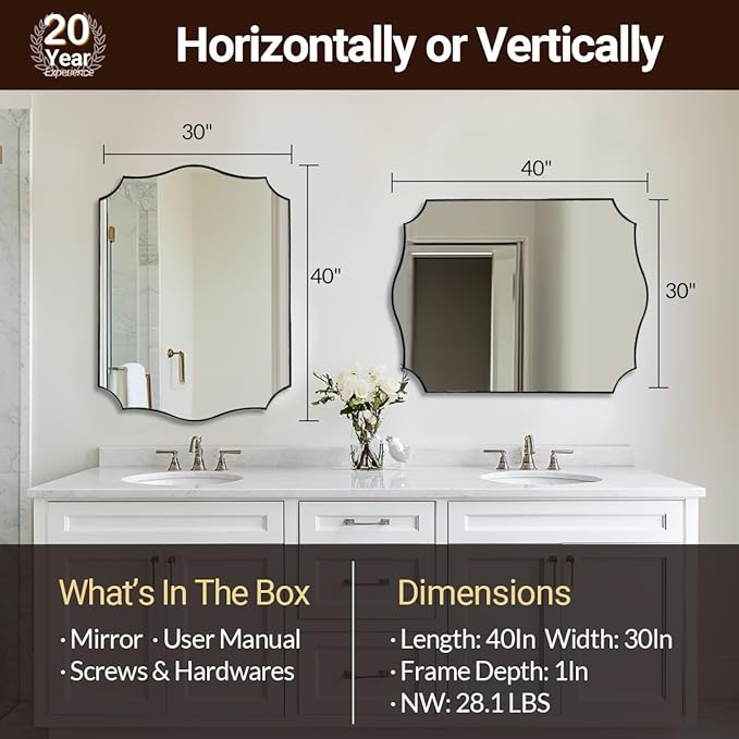 - 【Rust-Proof Stainless Steel Frame】: (N.W:28.1LBS). Crafted from stainless steel with oxidation-resistant properties, this mirror for bathroom offers enhanced stability and a longer lifespan. Shatterproof 4mm HD glass is supported by a 9mm MDF backboard (most others just 3mm ), surrounded by a 1/17" gap with unique curved corner design to give a seamless finish