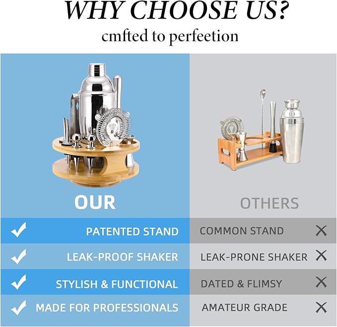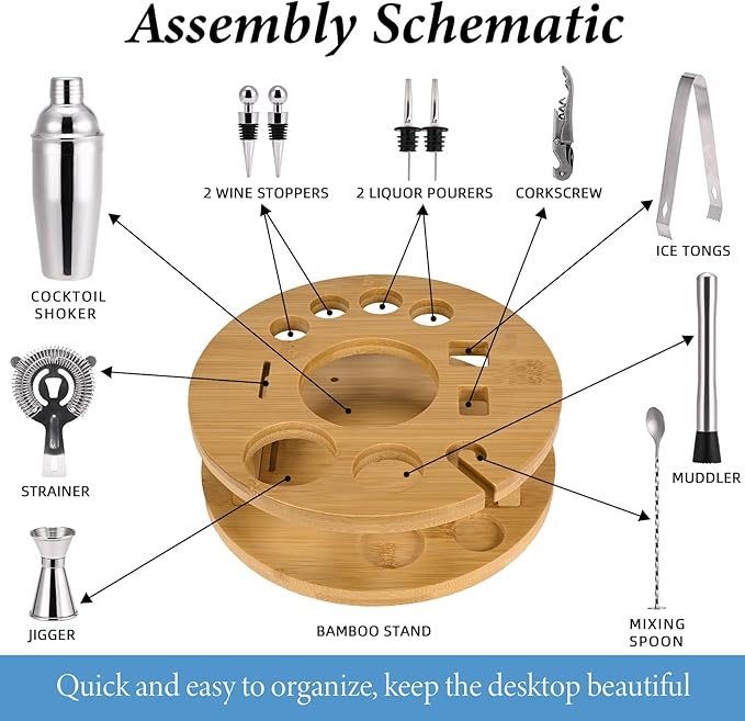 - 【User-Centric Elegant Design】: The cocktail shaker set comes with a stylish rotating wood stand, not only keeping your bar tools organized but also adding a touch of sophistication to your kitchen or home bar decor