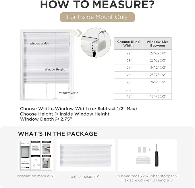 - No Drill Blinds: Enjoy no drill effortless installation with Joydeco’s tension-mounted design. Measure accurate size for inside mounts: The chosen cellular shade width should be less than or equal to the window's inside frame measurement, with a maximum reduction of 1/2 inch from the window size.