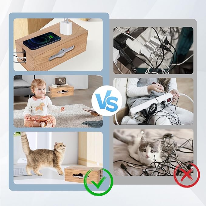 - 【Ventilation Design】- Our cable organizer uses classic and elegant wood design, which can perfectly integrate with any home or office environment. The side U-shaped vent design helps air circulation, heat dissipation effectively reduces the internal temperature of the storage box, and prevents damage caused by heating of wires and cables. it's important for electronic devices that have been used for a long time and can extend the service life of wires and connecting devices