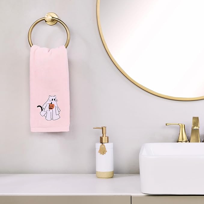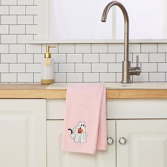 SKL Home Halloween Ghost Cat 100% Cotton Embroidered 2pc Hand Towel Set, Decorative for Bath/Kitchen/Bar & Gift, Pink