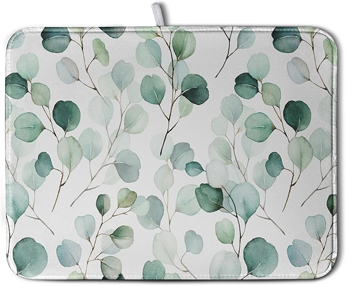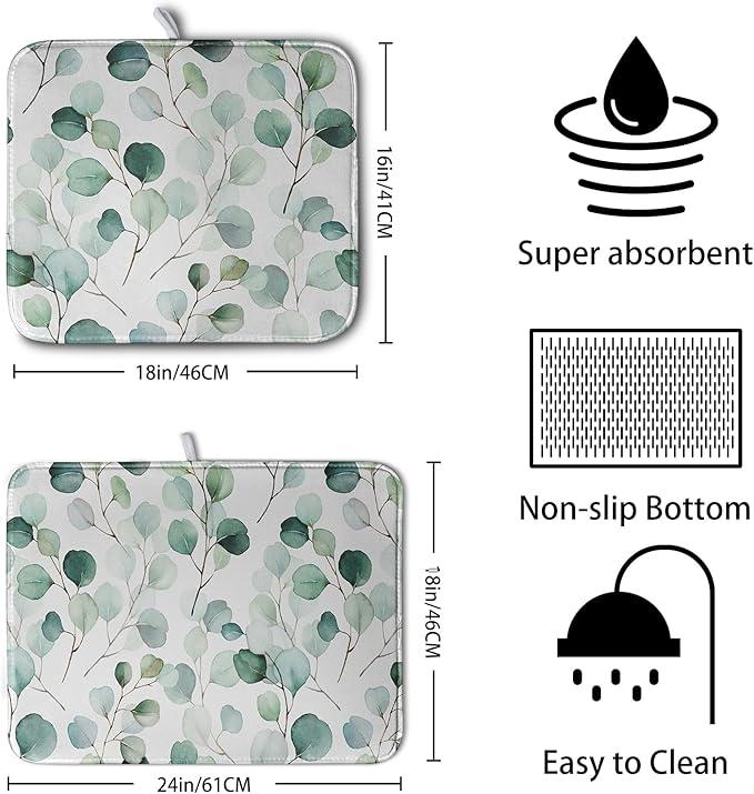 Green Leaves Dish Drying Mat Eucalyptus Leaf Branch Plant Drying Mats Absorbent Reversible Microfiber Kitchen Counter Mat Reusable Washable Dishes Drainer Mats Extra Large 18x24 Inch