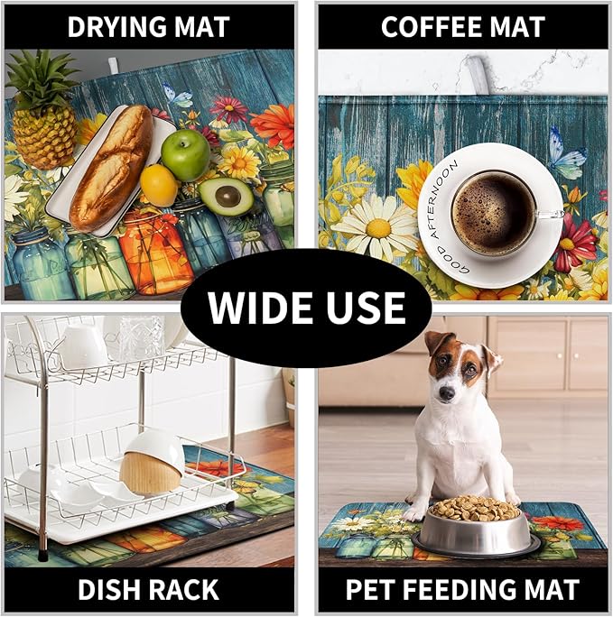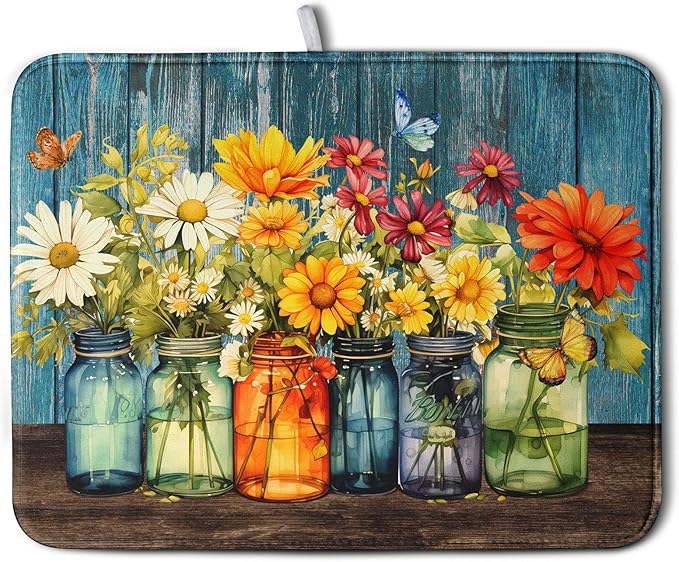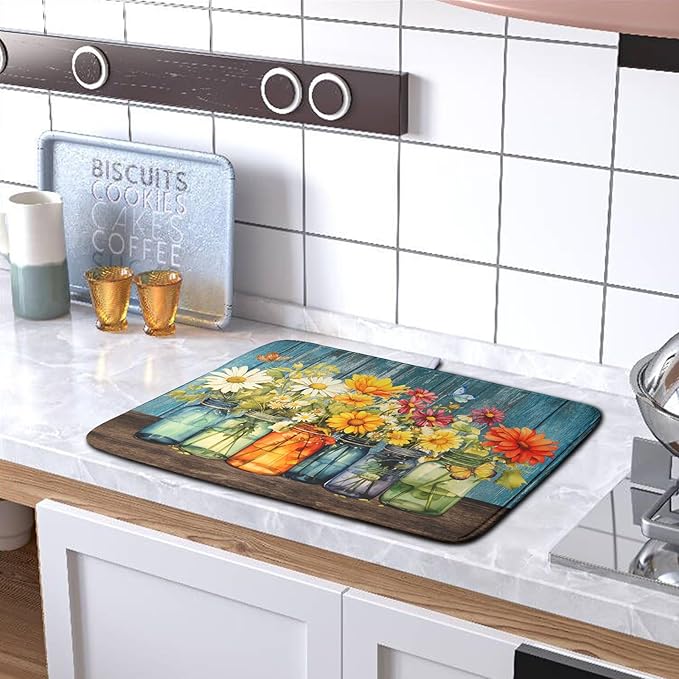 - Multifunctional Pad: Beautiful print on surface side, and reverses to a solid color. The floral mason jar kitchen drying mats absorbs water well, great for air drying dishes, glasses, bottles, silverware, fruits and vegetables, adds stability when drying fragile items