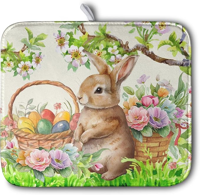 Easter Egg Bunny Dish Drying Mat for Kitchen Counter Floral Flower Basket Drying Mats Absorbent Dish Pad Spring Summer Holiday Medium Dish Draining Mat 18x24 inch