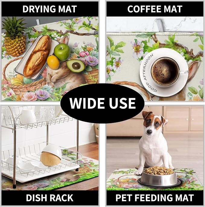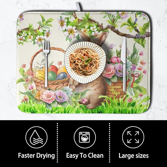 - Multifunctional Pad: Beautiful print on surface side, and reverses to a solid color. The easter kitchen drying mat absorbs water well, great for air drying dishes, glasses, bottles, silverware, fruits and vegetables, adds stability when drying fragile items