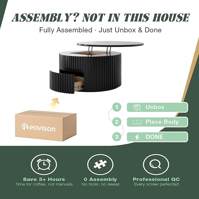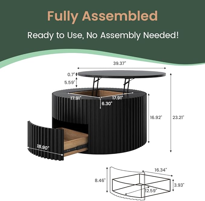 POVISON Round Coffee Table with Storage, Lift Top Coffee Table for Living Room, 39.37" Fluted Mid Century Modern Center Table for Home, Office, Black, Fully Assembled