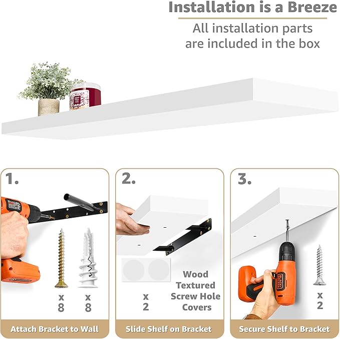 - Easy to Install: Minor assembly required, detailed instructions included. Hanging shelves are made of beautiful, engineered faux wood (not solid wood) with a smooth matte finish. Enhanced steel brackets attach firmly to the wall. Sturdy enough to hold up to 22 lbs. Mounting hardware INCLUDED. Color of bathroom shelf may be slightly different from the product photos due to lighting and screen settings