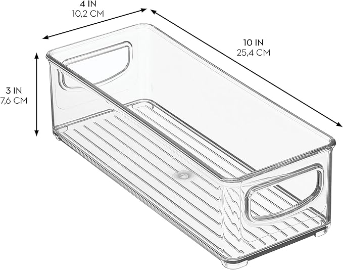 - SMART STORAGE - Reinvent your kitchen space with our iDesign Stackable Pantry Bins; These clear, open-top bins grant immediate reach-in access to food and other perishables, making it easy to find what you need; Bins stack securely to make use of often-wasted vertical space; Easy-grip handles make it easy to move or slide off shelves; The narrow profile fits inside standard or counter-depth refrigerators as well as tight shelf spaces inside pantries and cabinets; Set of 2