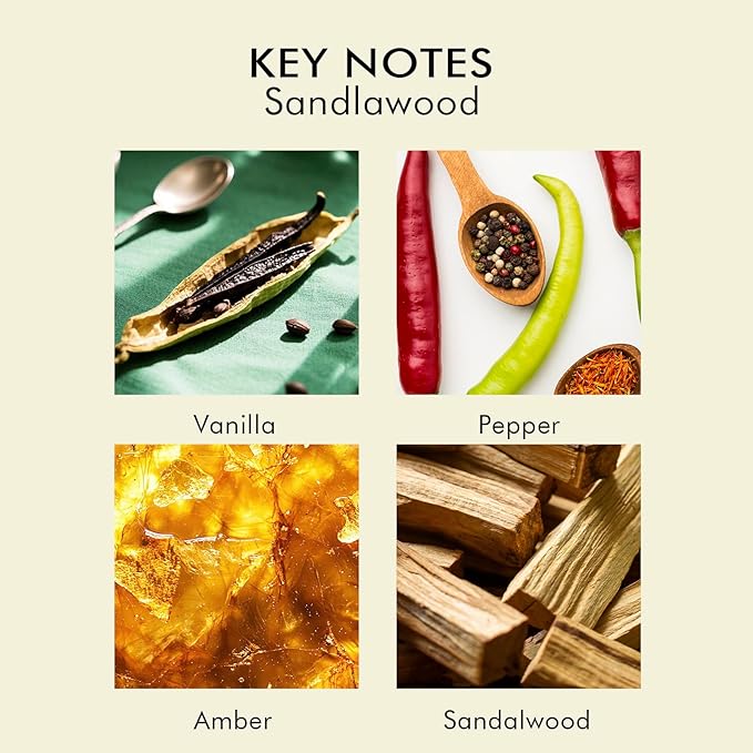 - Sandalwood: A warm and sensual blend of creamy vanilla, spicy pepper, rich amber, and smooth sandalwood for a comforting yet captivating allure.