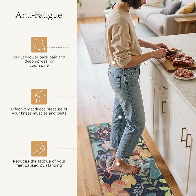 - Anti-Fatigue: Crafted with high-density memory foam mat, our kitchen floor rug delivers superior cushioning like built-in floor cushions for feet, knees, and back during long cooking sessions or as a standing desk mat. This ergonomic design significantly reduces joint pressure and fatigue while prepping meals, washing dishes, or working. Essential kitchen accessories and desk accessories for comfort in your home and kitchen. Say goodbye to tired feet