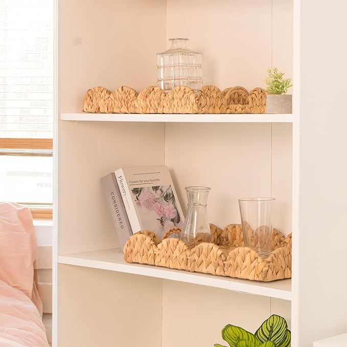 KOKODO Set of 2 Wicker Scalloped Tray – Handwoven Water Hyacinth Basket Trays, Decorative Scalloped Wicker Tray for Serving, Organizing, Kitchen, Coffee Table, Bathroom, and Shelf Décor.