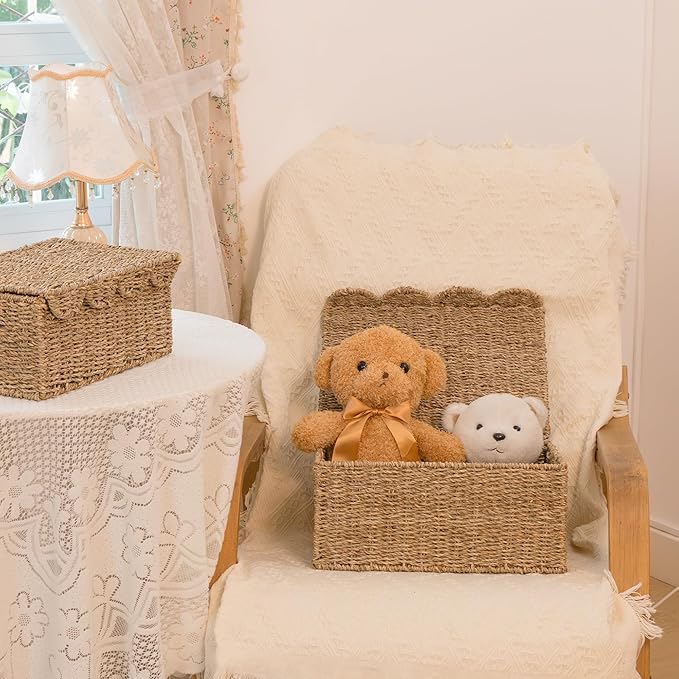 KOKODO Set of 2 Scalloped Wicker Baskets β Handwoven Rectangular Seagrass Storage Baskets with Lid and Handles for Organizing, Bathroom, Living Room & Shelf DΓ©cor β Decorative Rattan Organizing Bins