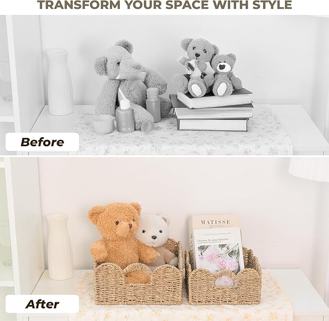 - πΏ Handwoven Elegance & Versatile Sizes β Comes in two convenient sizes: Large (15"L x 11.25"W x 7"H) & Small (13"L x 9"W x 6.25"H), great for stylish and functional storage in any space.