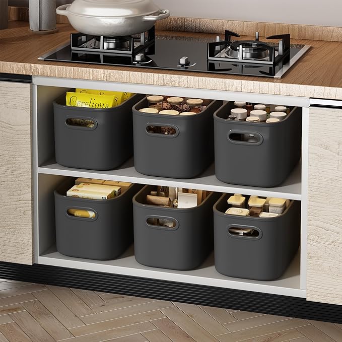 12 Pack Grey Plastic Storage Bins, Pantry Organizer Bins, Grey Plastic Containers for Organizing, Storage Box for Kitchen, Cabinet, Closet, Office, Classroom, Under Sink