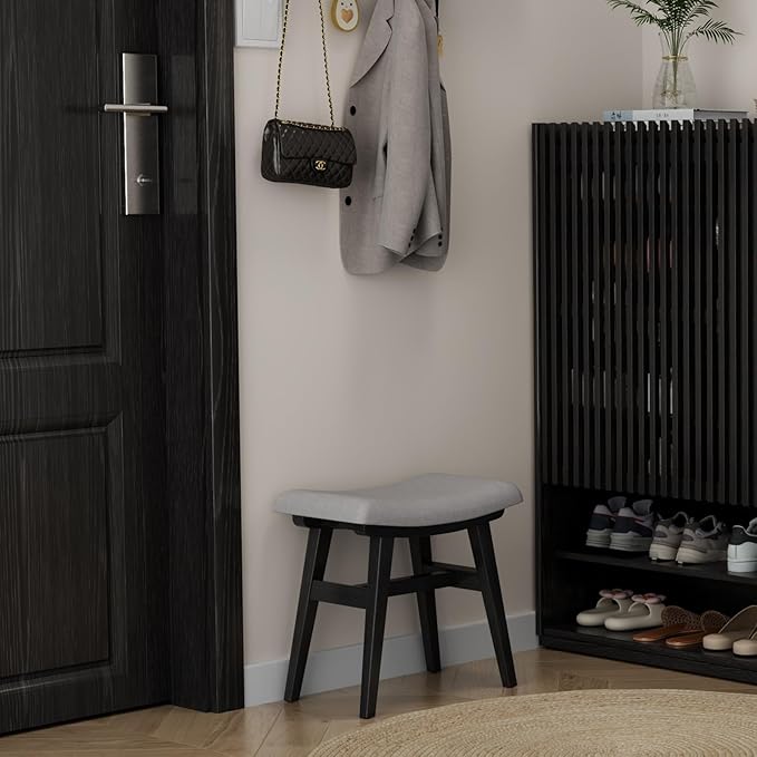 Solid Wood Small Vanity Stool, Compact Makeup Chair with Saddle Cushion, Linen-Covered High Rebound Sponge Seat, Easy Assembly Footstool for Bedroom, Entryway, Home, Black