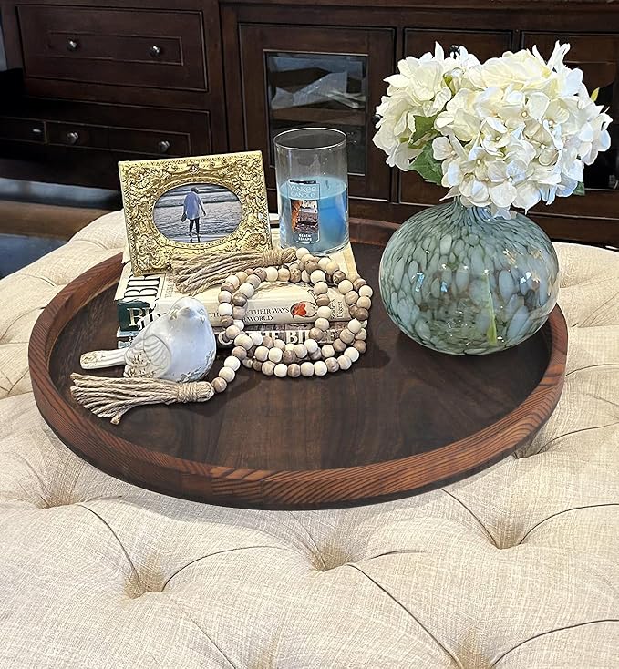 20" Rustic Wooden Serving Tray - Extra Large Round Ottoman Table Tray for Farmhouse Decorative Oversized Coffee Table Trays Living Room Kitchen Counter Breakfast Brown