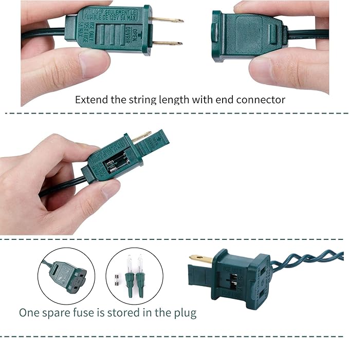 - Easy to use and Connectable - These outdoor patio lights offer effortless plug-and-play installation with standard outlet compatibility, featuring end-to-end connectors that support up to 10 interconnected strands (210ft total) for flexible customization across patio canopies, garden pergolas, or indoor event spaces. and we provided 1 spare fuse in the male plug for replacement