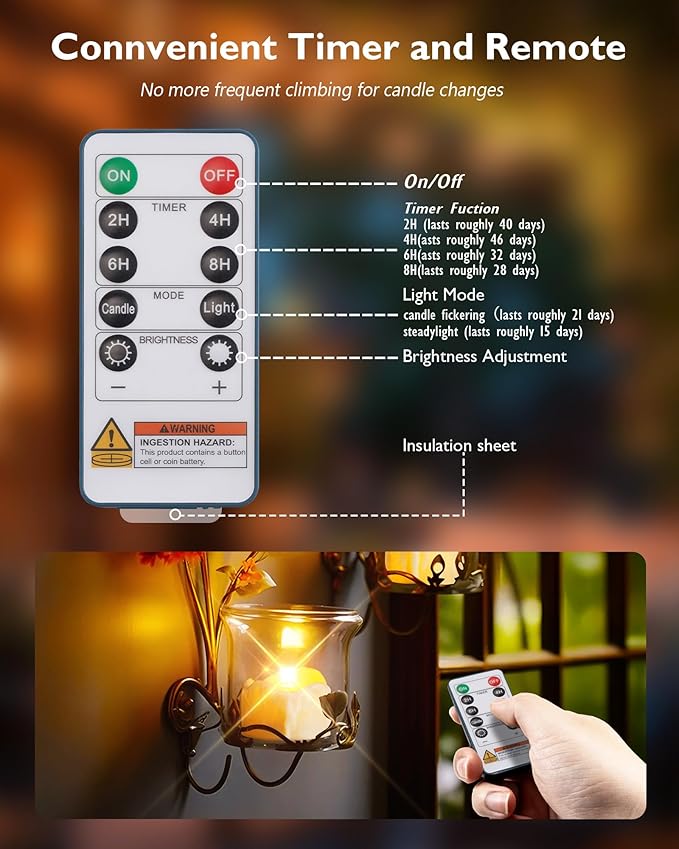 - ENJOY THE CONVENIENCE: No more bending, reaching, or climbing—use the 10-key remote to turn candles on/off and set timers from anywhere. Whether mounted in lanterns or placed in wall sconces, enjoy instant ambiance at your fingertips.