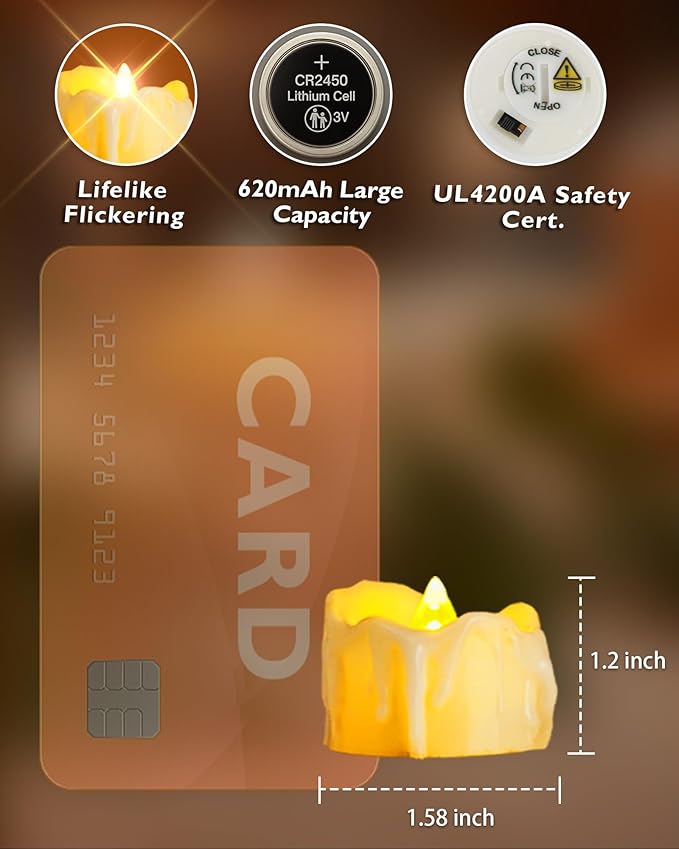 - LIFELIKE AND WORRY-FREE: Realistic melted look with flickering flame effect—zero fire risk, no wax mess. Safe for use around kids, pets, curtains, and even during outdoor parties where real candles blow out easily