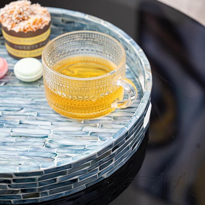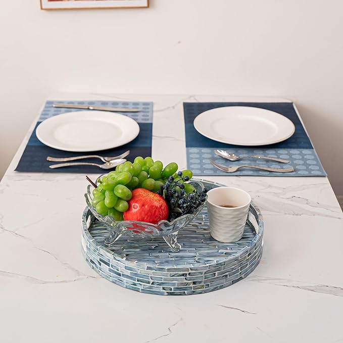 - [STYLISH MOSAIC TRAYS] with the great workmanship by Vietnamese artisans at PEMAR, flawlessly finished with strong wood core and blue mosaic pattern well-sorted mother of pearls / capiz shells lacquered on the surfaced. Our round lacquer tray creates an elegant handmade decorative centerpiece to your dining table, coffee table or any room, best matches any beach/coastal/mosaic theme