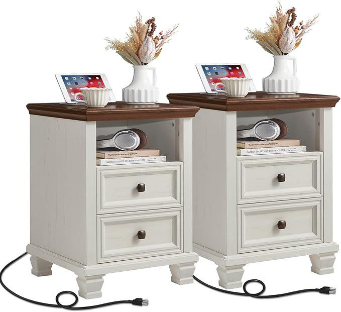 Farmhouse Nightstand Set of 2 with Charging Station, Rustic White Nightstand,2 Drawers End Table for Living Room,Bedside Table with Open Shelf for Bed Room,White