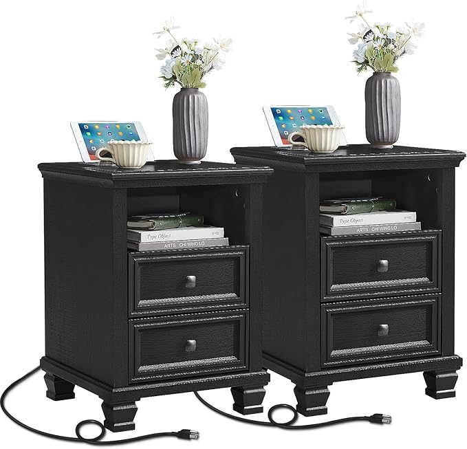 Farmhouse Nightstand Set of 2 with Charging Station, Rustic Black Nightstand,2 Drawers End Table for Living Room,Bedside Table with Open Shelf for Bed Room,Black