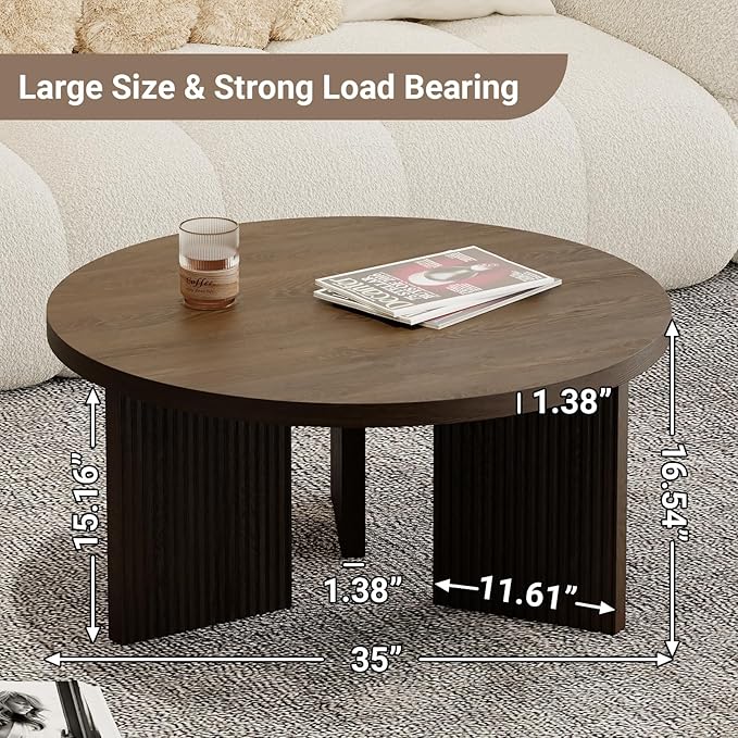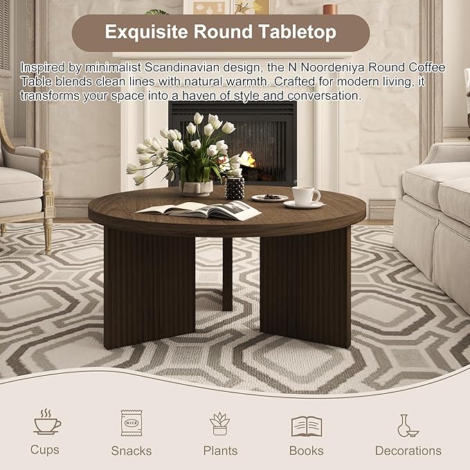 - Sturdy Wooden Coffee Table: Our classic round coffee table boasts a high-quality wood grain veneer finish that imitates the natural beauty and texture of walnut. The waterproof and wear-resistant multi-step finish process protects the wood grain veneer while ensuring it remains looking sleek over time. The simple yet attractive design creates a classic look, whether minimalist or luxurious.