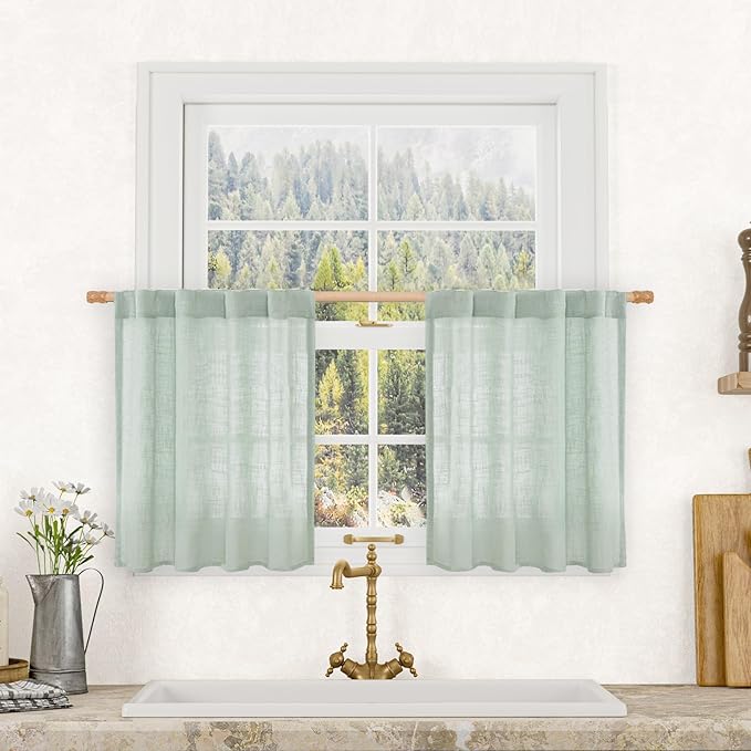 LAMIT Short Kitchen Linen Curtains 24 Inch Length for Small Windows, Semi Sheer Light Filtering Panels Back Tab and Rod Pocket Cafe Drapes for Half Window, Light Sage, 2 Panels, 34 x 24 Inch
