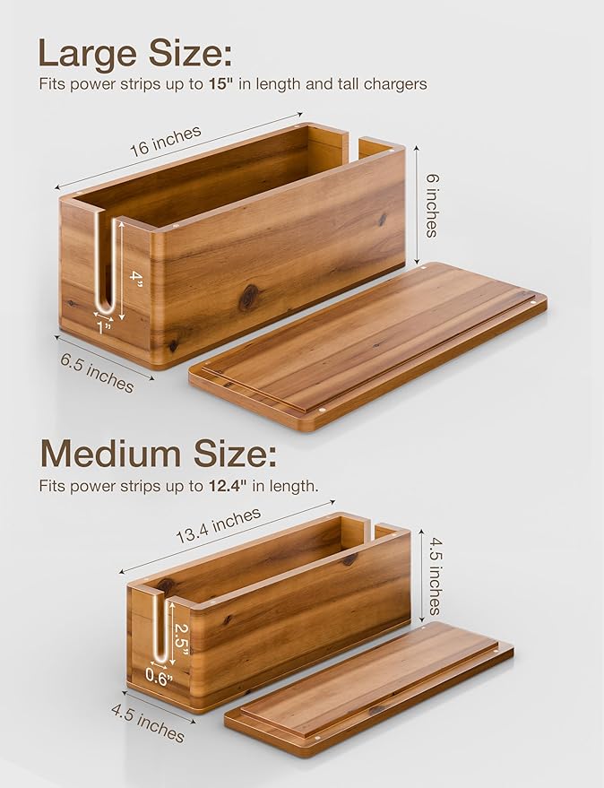 - Set of 2 Sizes: This set includes a large cable management box 16" and a smaller box 13.5". The large box can store bulky adapters, extension cord, and most standard power strip, while the small cord box is perfect for organizing slim cord, remotes, chargers, or office accessories