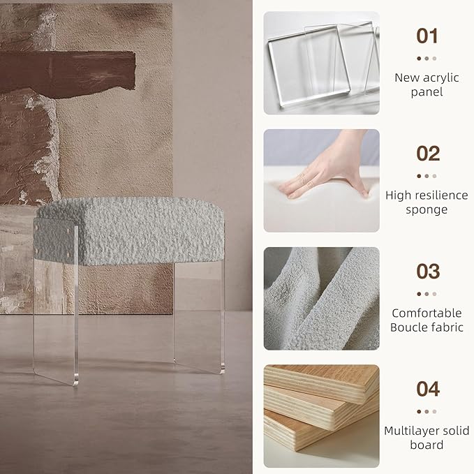Soft Fluffy Stool, Modern Acrylic Footstool with Upholstered Seat, Fluffy Stool for Living Room Bedroom (Grey)