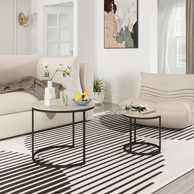 - 【Space-Saving Nesting Coffee Table Set】This set features a large round coffee table (Φ 23.6x17.9 inches) and a small end table (Φ 15.7x 15.6 inches). The small table conveniently nests under the larger one, saving valuable space in your living room or office.