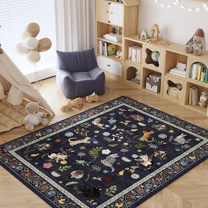 Rugcomf Area Rugs 8x10 Rug for Living Room Clearance Washable Boho Area Rug Non Slip Floral Animal Cat Vintage Low Pile Large Rug for Bedroom Farmhouse Dining Room Kids Playroom, Cobalt Blue