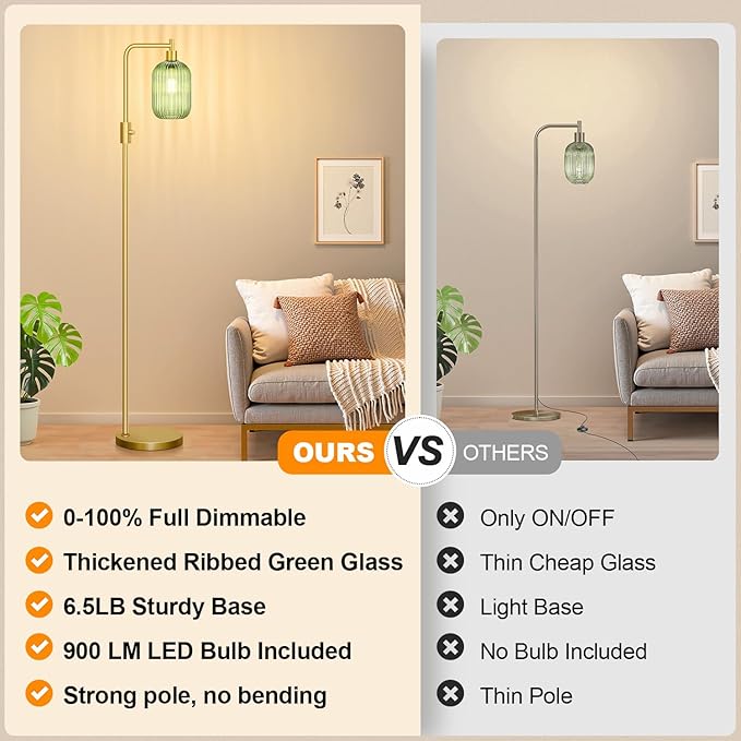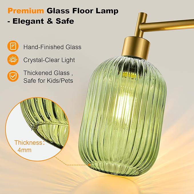 - Unique Green Ribbed Glass: The standing lamp features a thickened glass shade with unique green ribbed glass, distinct from normal glass lamps. This glass floor lamp transmits 90% of light for exceptional brightness, while its diffused glow ensures gentle, eye-friendly illumination. The beautiful glass shade delivers clear visibility, perfect for reading or ambient lighting.