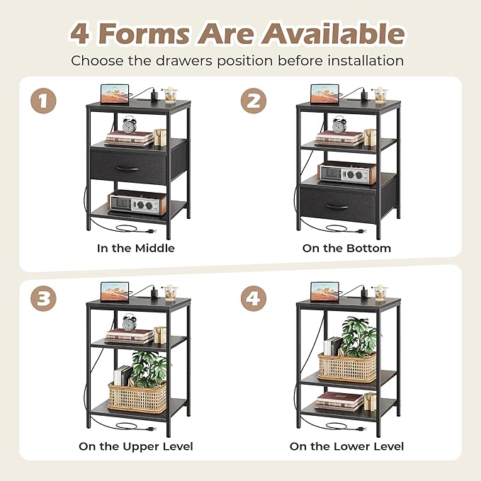 - 【Adjustable Drawer Setup】 Install your drawer in the middle or at the bottom to fit your space layout. This updated couch side table boasts 3 spacious shelves and a spacious fabric drawer, making it easy to organize everything from nighttime reads to various devices